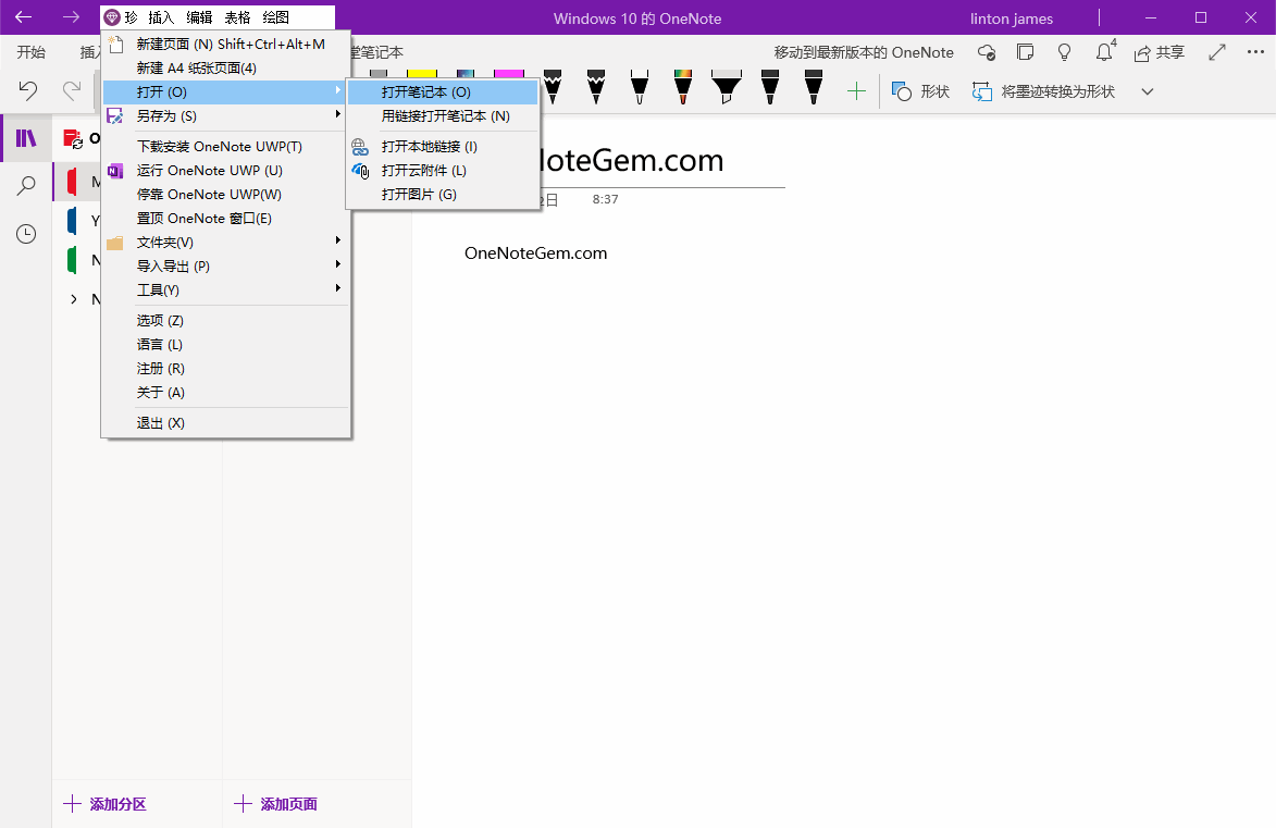 我们可以通过珍宝菜单 Gem Menu for OneNote UWP 的“打开笔记本”菜单项来识别哪些笔记本已经被删除。在珍宝菜单中点击 “珍” 菜单 -》打开 -》“打开笔记本“ 菜单项。