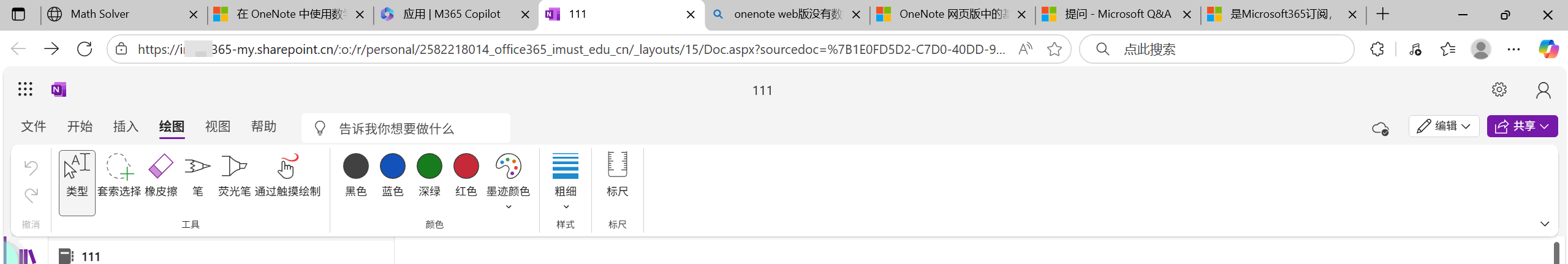 为什么我的微软学校账户登录 Web OneNote,绘图选项卡里没有“数学助手”功能?